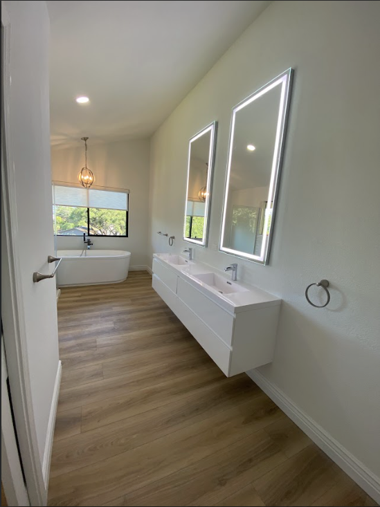 Relocated vanity, rebuilt into a sleek double-sink design for more storage and convenience