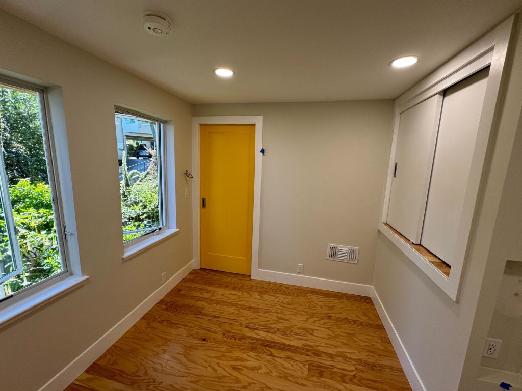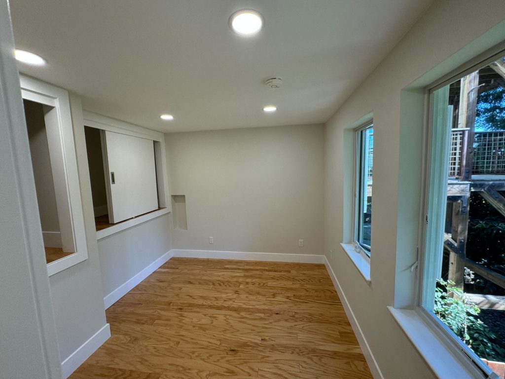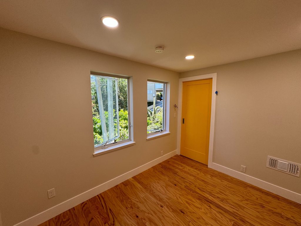 This San Francisco basement was transformed into a bright, functional office and storage space through strategic structural reinforcement, upgraded electrical and HVAC systems, new smoke detection, and fresh interior finishes. The project includes new engineered wood flooring, modern recessed lighting, smooth walls, custom sliding doors, and improved ventilation—turning an underused area into a polished, highly usable extension of the home.