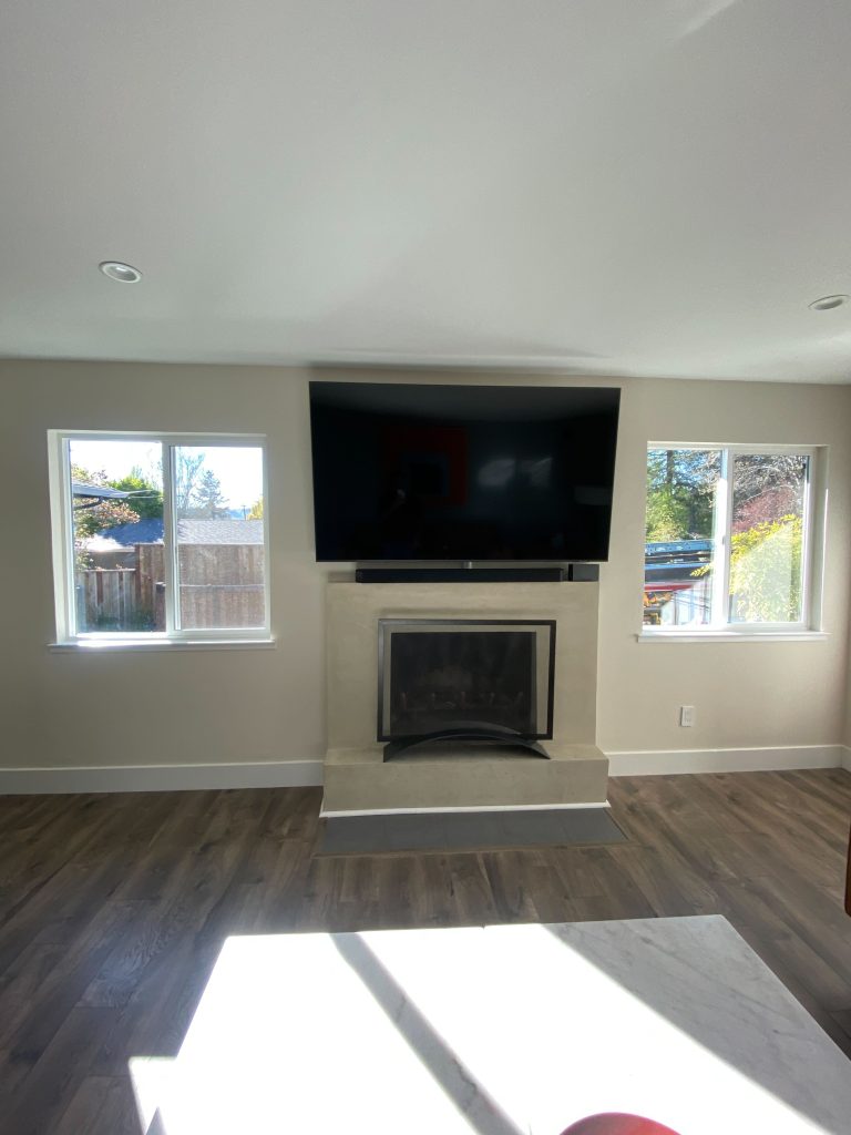 The living room received a complete refresh with new flooring, updated paint, and a redesigned fireplace wall featuring a mounted TV and clean, contemporary finishes. Large windows and sliding glass doors enhance natural light while connecting the indoors to the outdoor area. The result is a cohesive, stylish, and highly functional living environment tailored for everyday comfort and entertaining.